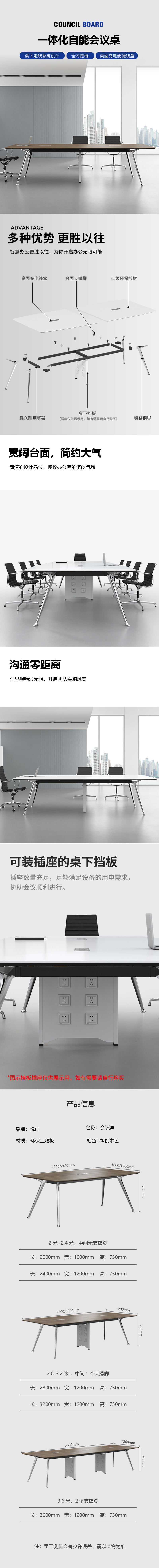 悦山 会议桌简约现代会议室桌培训卓长条桌 胡桃木色 2400*1200*750*1张