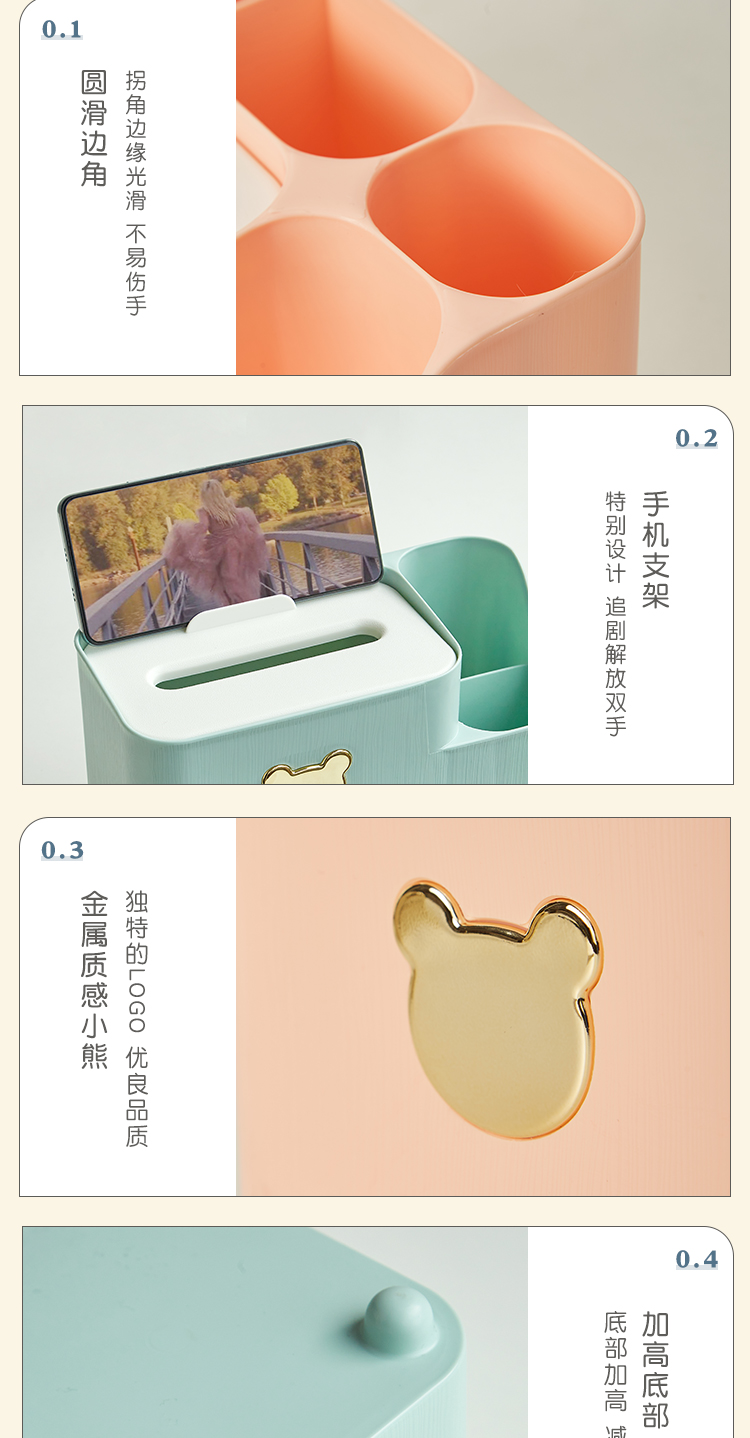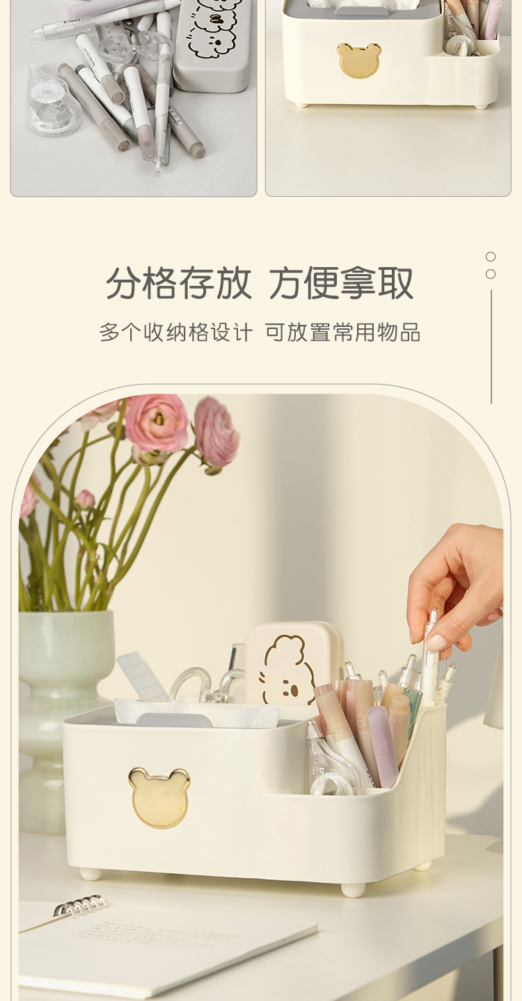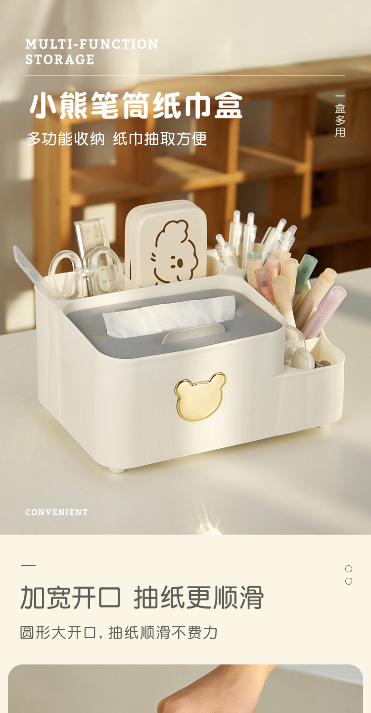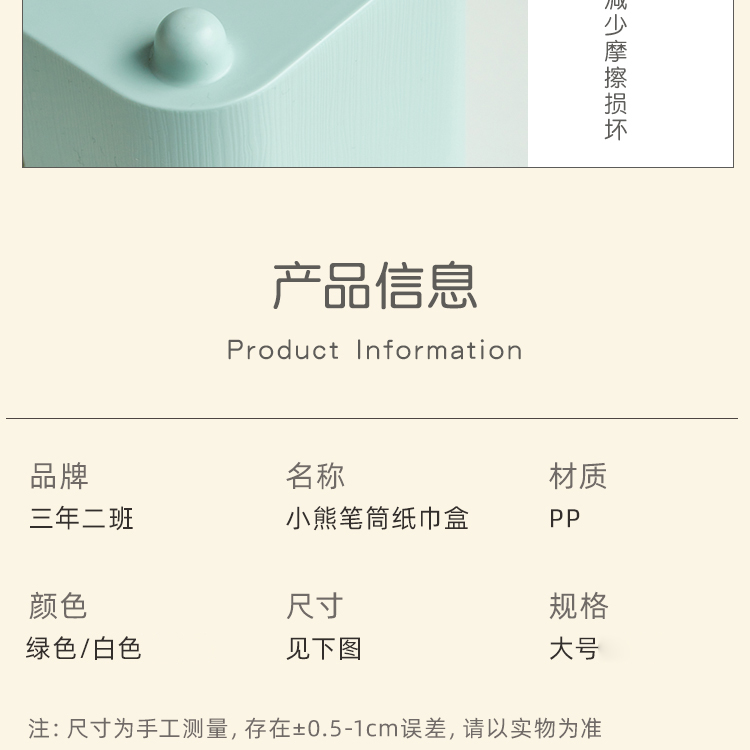 三年二班 小熊笔筒大容量收纳盒学生轻奢简约笔桶创意文具办公室桌面纸巾收纳摆件 /个 绿色大号