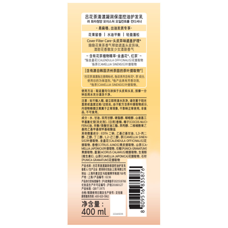 吕花茶清漾凝润保湿控油护发乳(柚子红茶)400ml(单位:瓶) 灰橙色