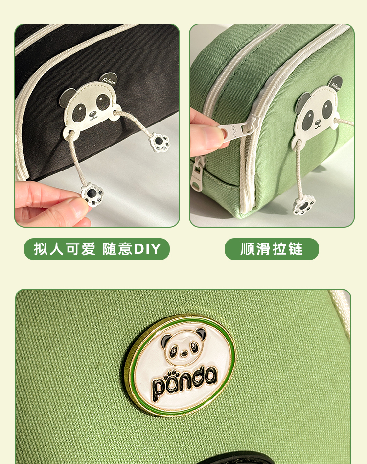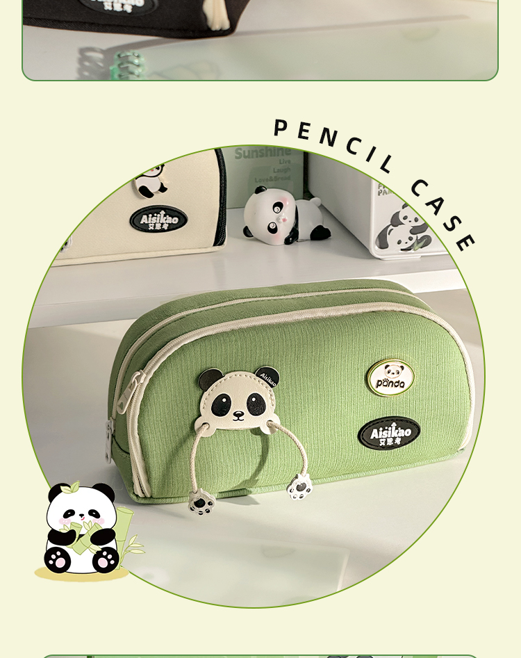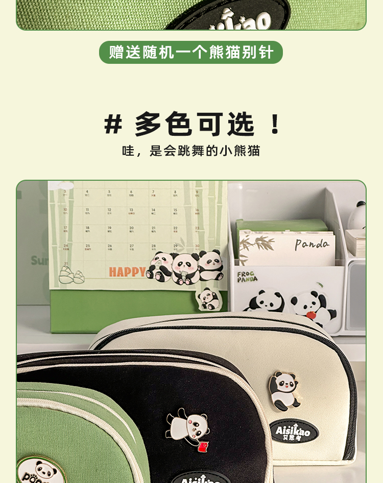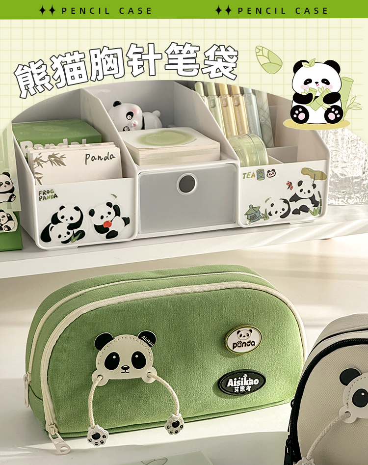 三年二班 熊猫胸针笔袋大容量初中文具盒高中生铅笔盒简约笔盒小学生文具袋帆布铅笔袋/个 熊猫绿色款