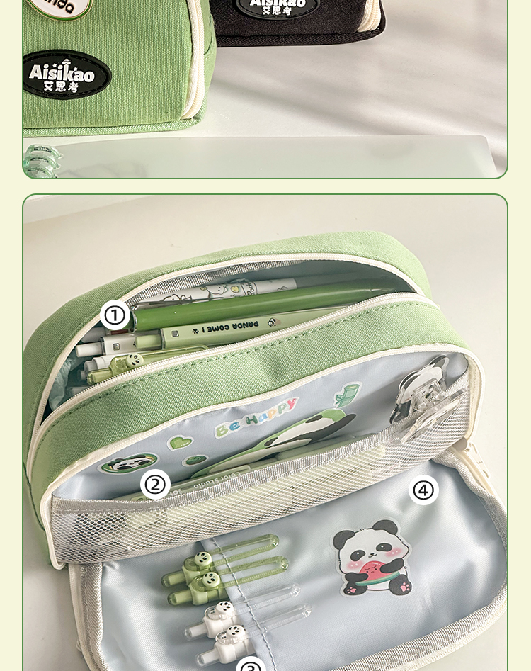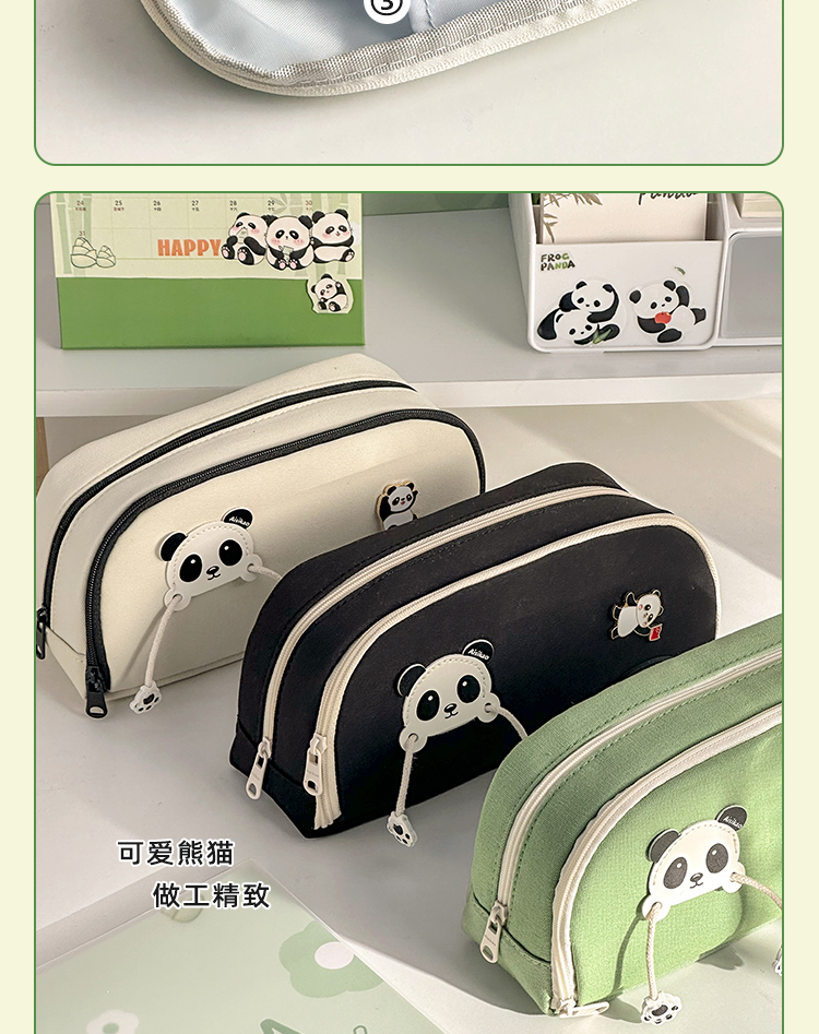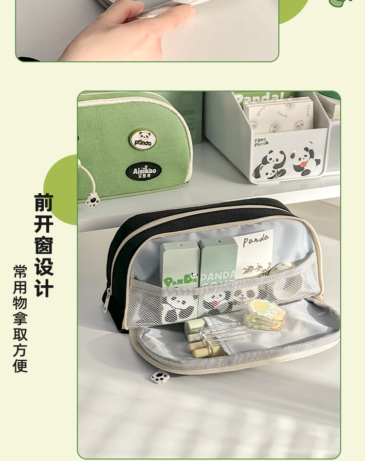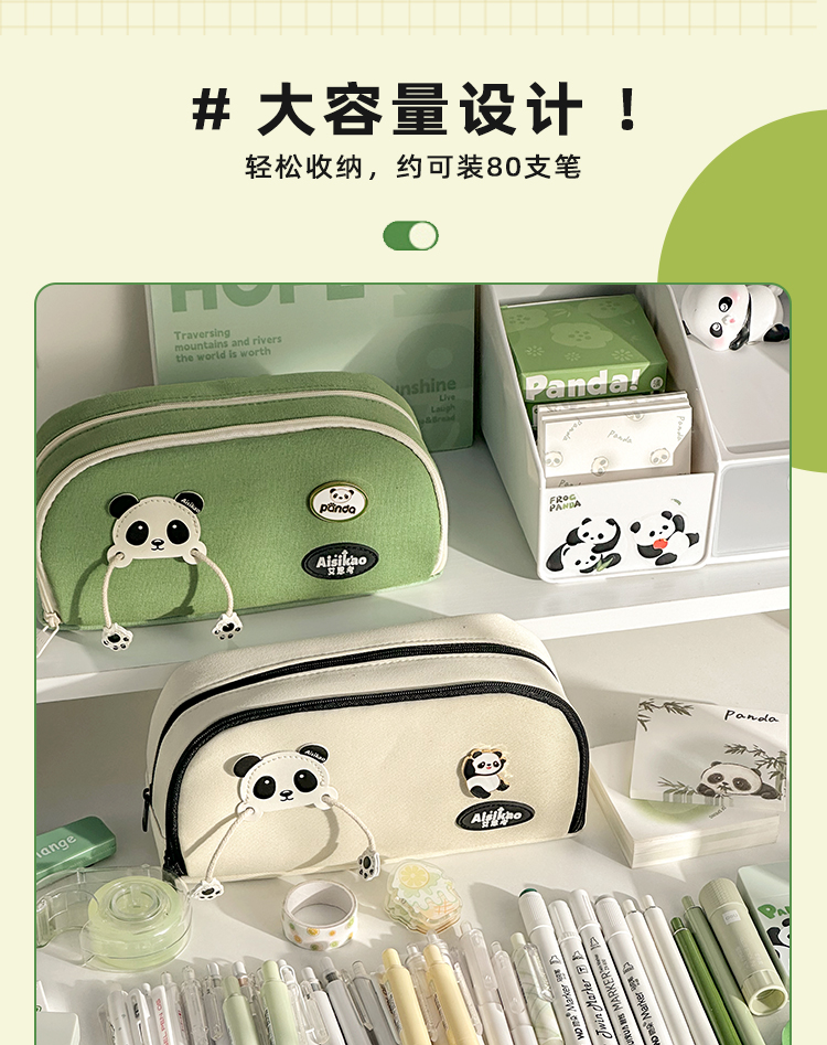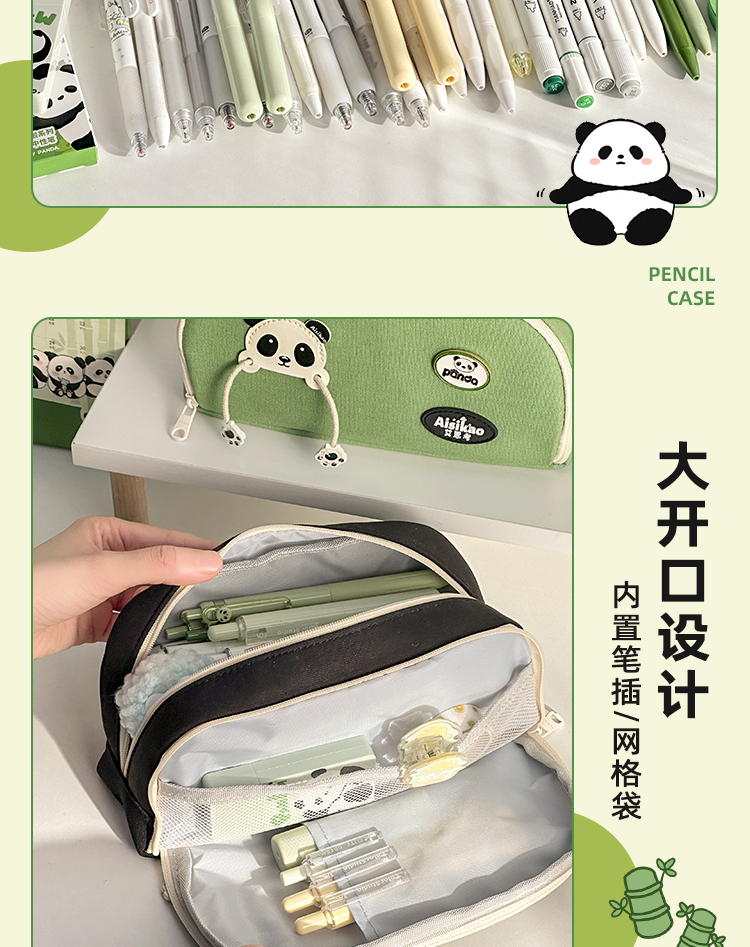 三年二班 熊猫胸针笔袋大容量初中文具盒高中生铅笔盒简约笔盒小学生文具袋帆布铅笔袋/个 熊猫绿色款