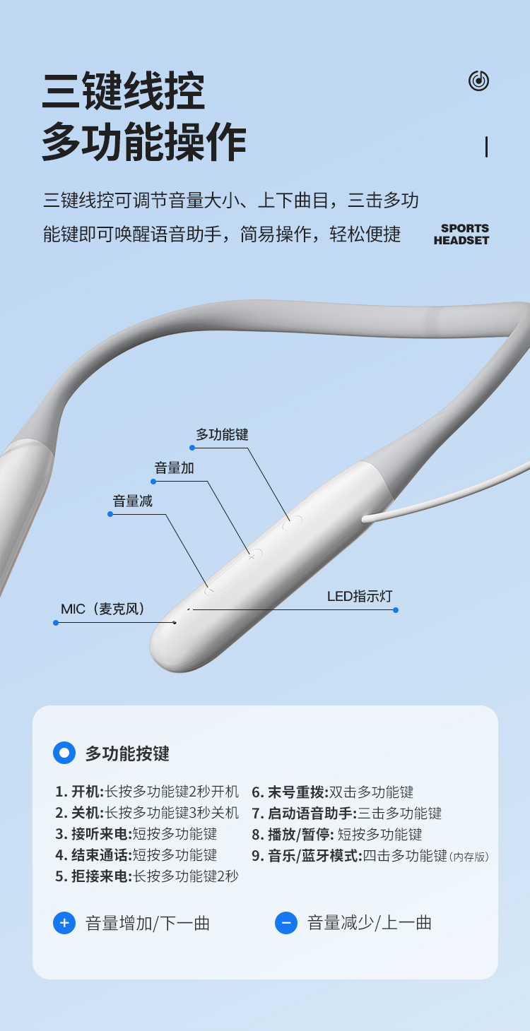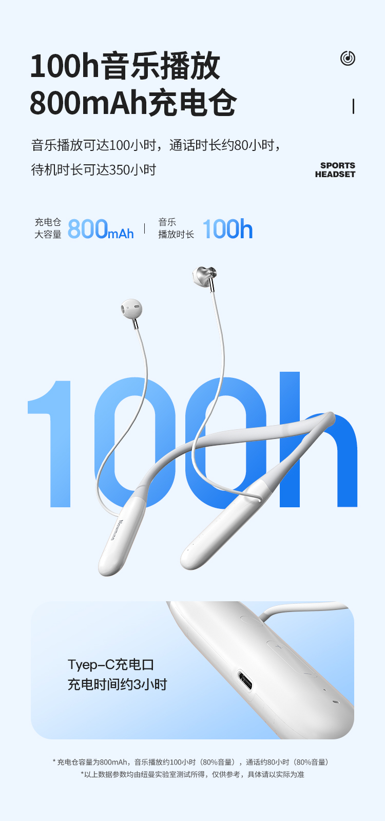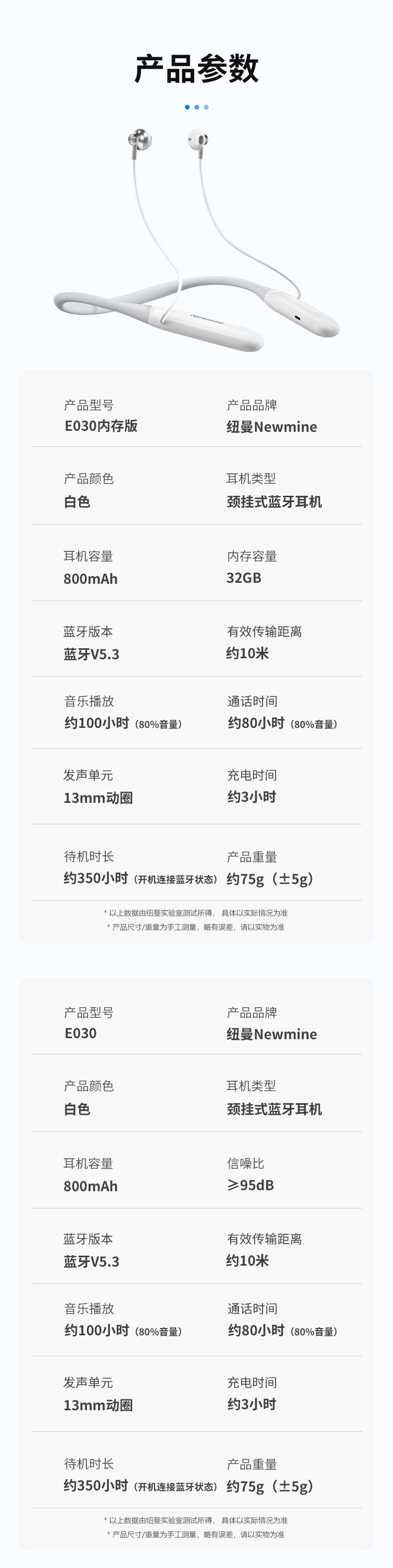 纽曼颈挂式运动蓝牙耳机超长续航蓝牙5.3降噪HIFI音质跑步音乐E030 单位:个 白色
