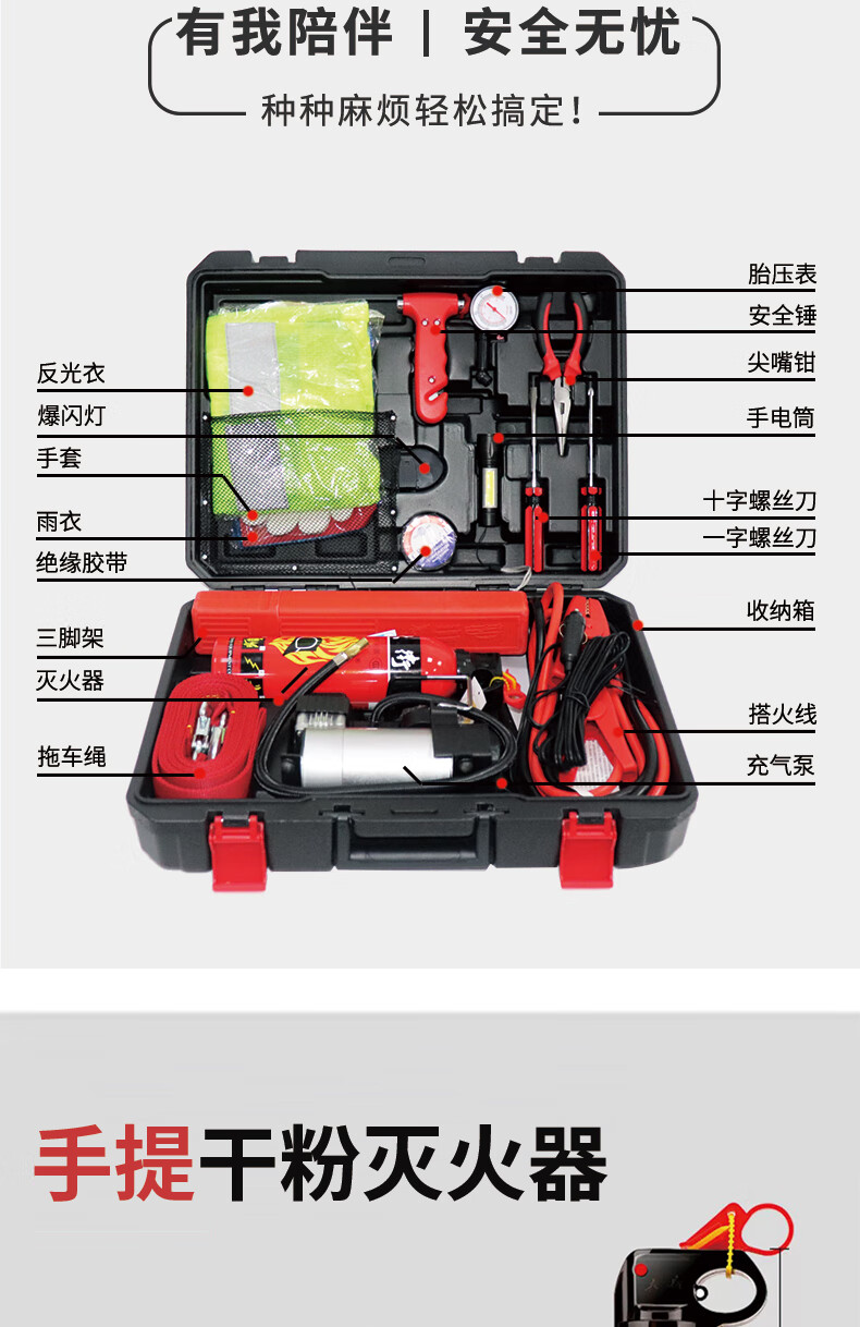 鸣固 100068140245 车载应急包 应急救援工具箱多功能急救包灭火器反光衣18件套 年检无忧行车必备品质 黑色(单位:箱)