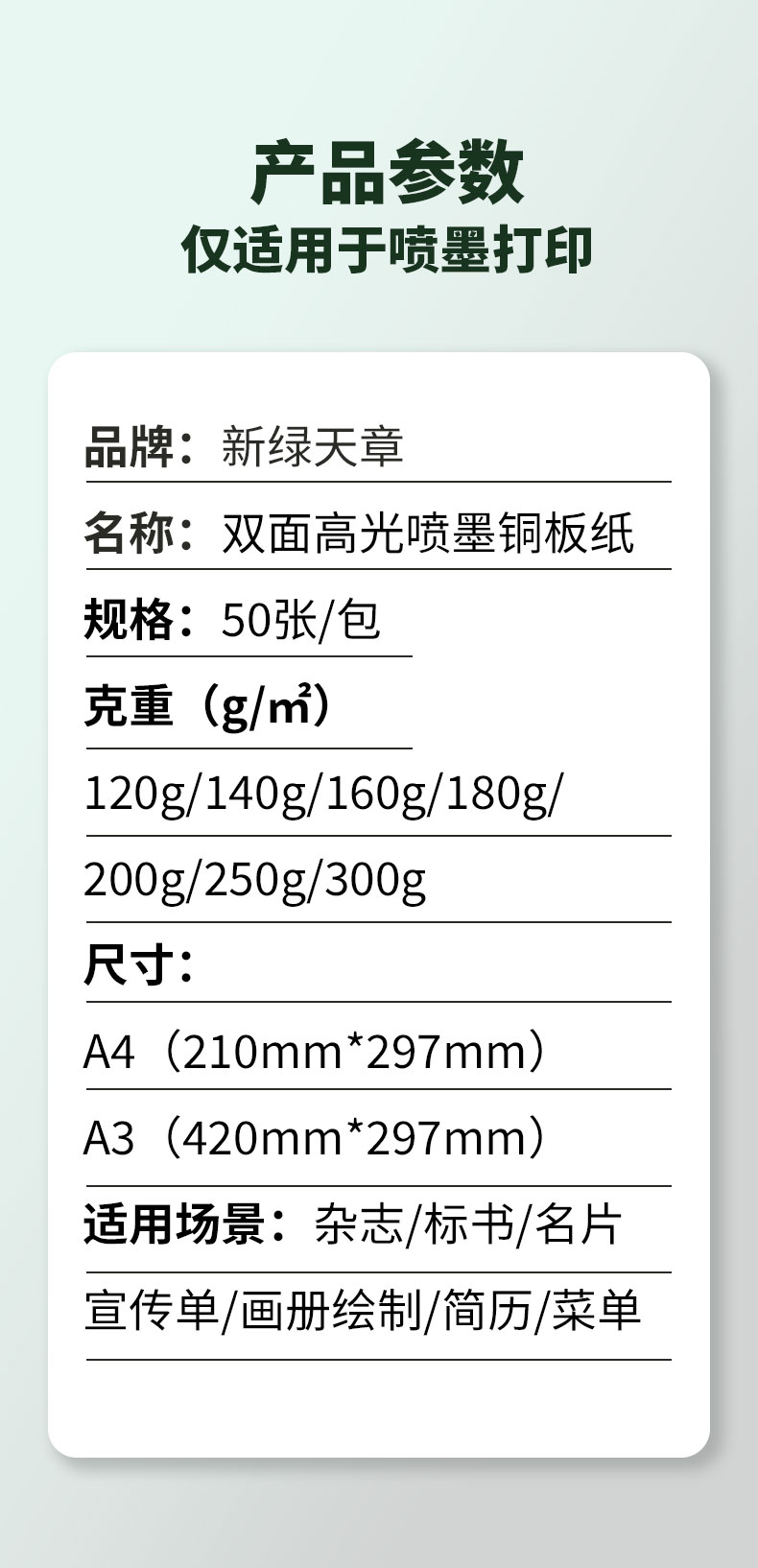 新绿天章 P1274 A4 200G 50页/包 双面喷墨高光铜版相片 白色(单位:包)
