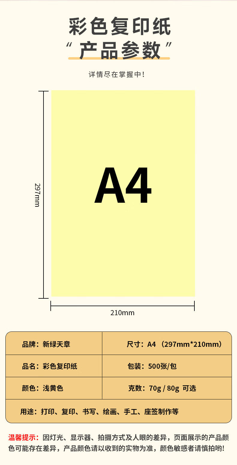 新绿天章 DIY折纸 A4 70g 500页 彩色复印纸 浅黄色(单位:包)