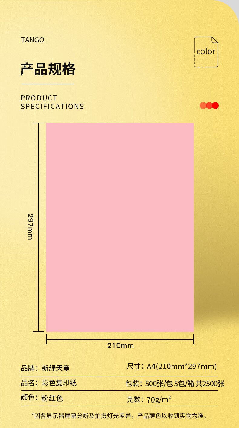 新绿天章 儿童手工彩色纸 70g A4 500张/包 5包 彩色复印纸 粉红色(单位:箱)