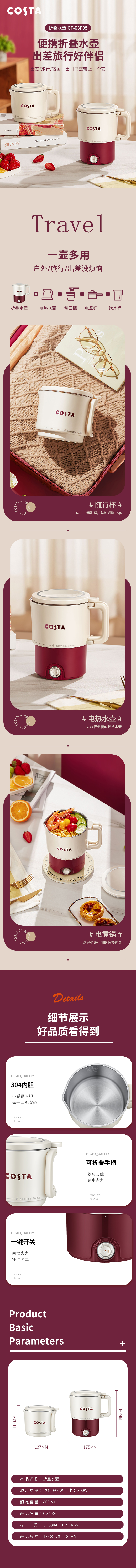 COSTA 电热水壶 CT-03F05 0.8L 白色+红色(单位:台)