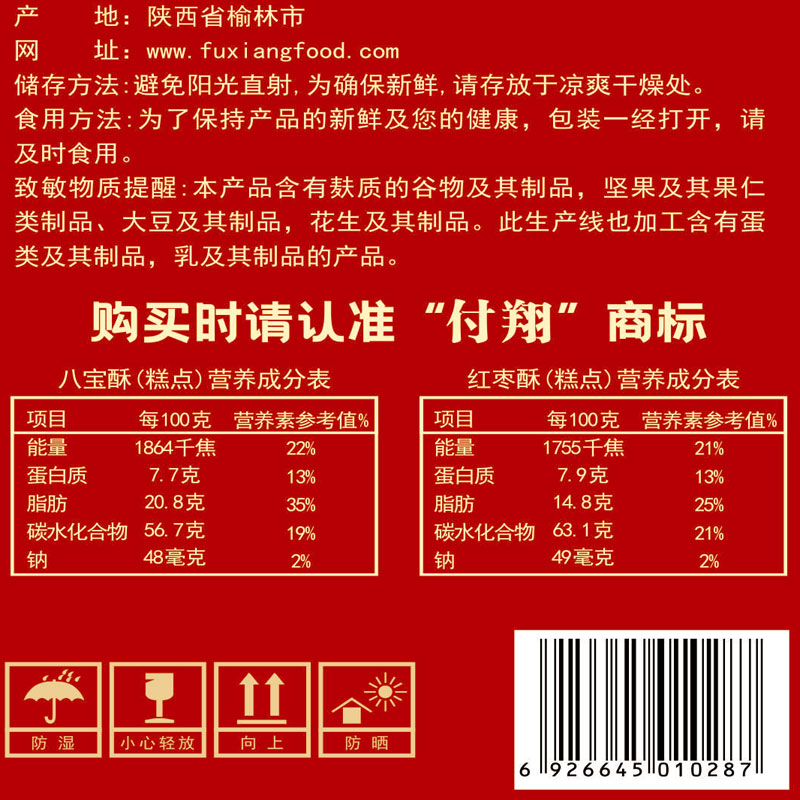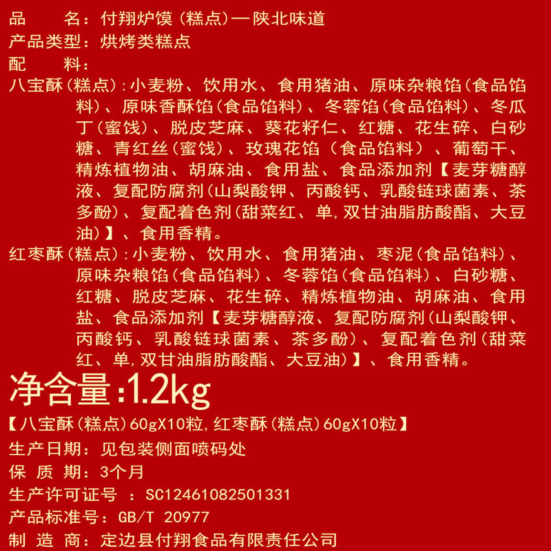 付翔 手工炉馍 陕北味道 1.2kg(八宝酥60g*10粒 红枣酥60g*10粒) 混合 混色(单位:盒)