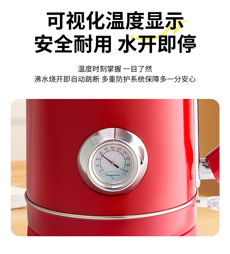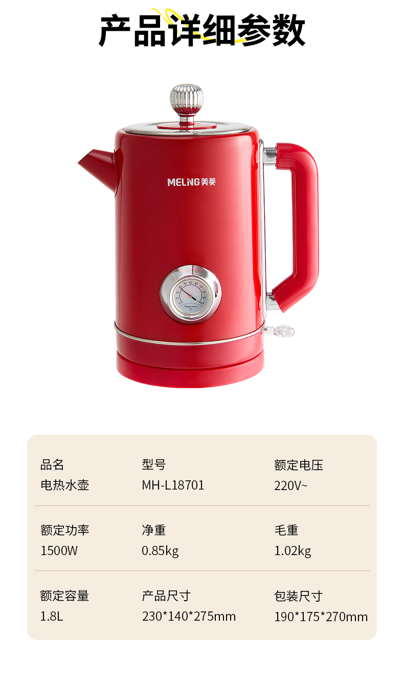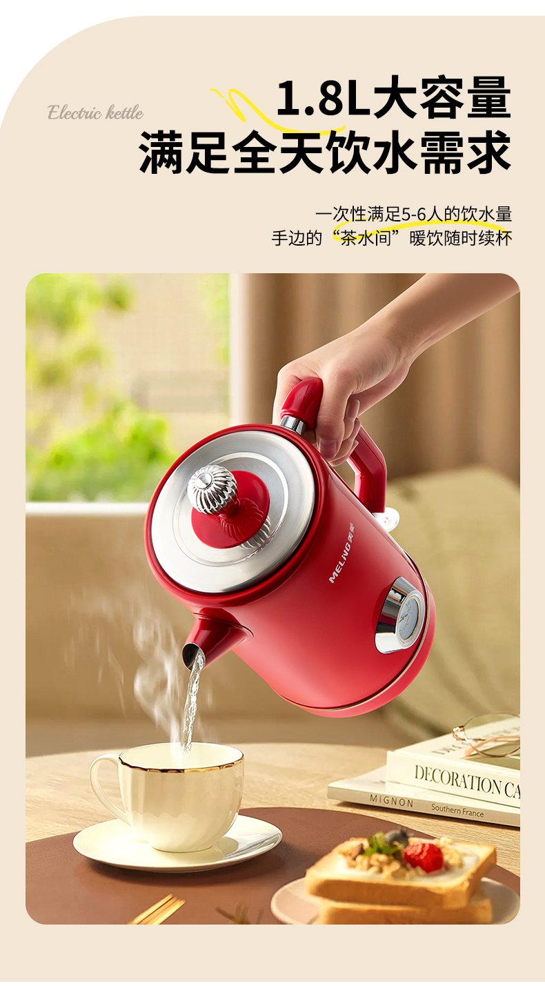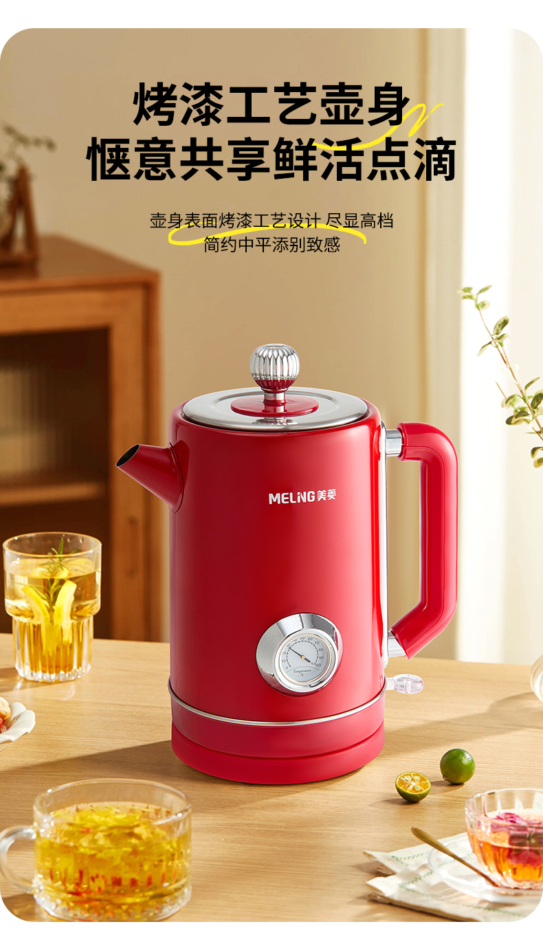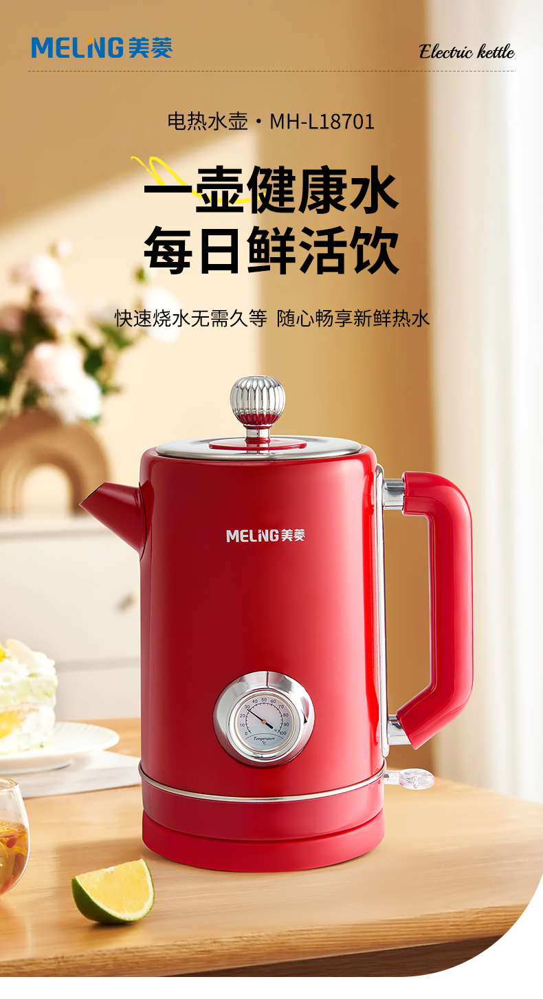 美菱(MeiLing) 家用带温度显示复古电水壶 烧水壶 MH-L18701 1.8L 红色(单位:台)