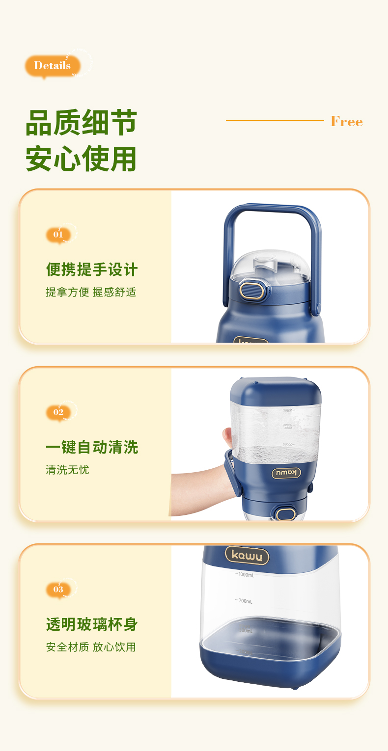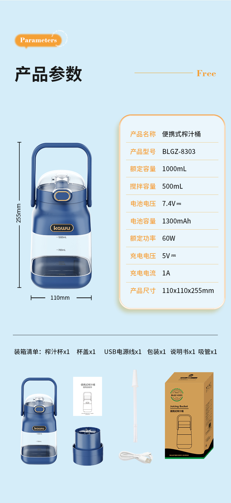 卡屋(kawu) 便携式玻璃榨汁机 BLGZ-8303 1L 蓝色(单位:台)
