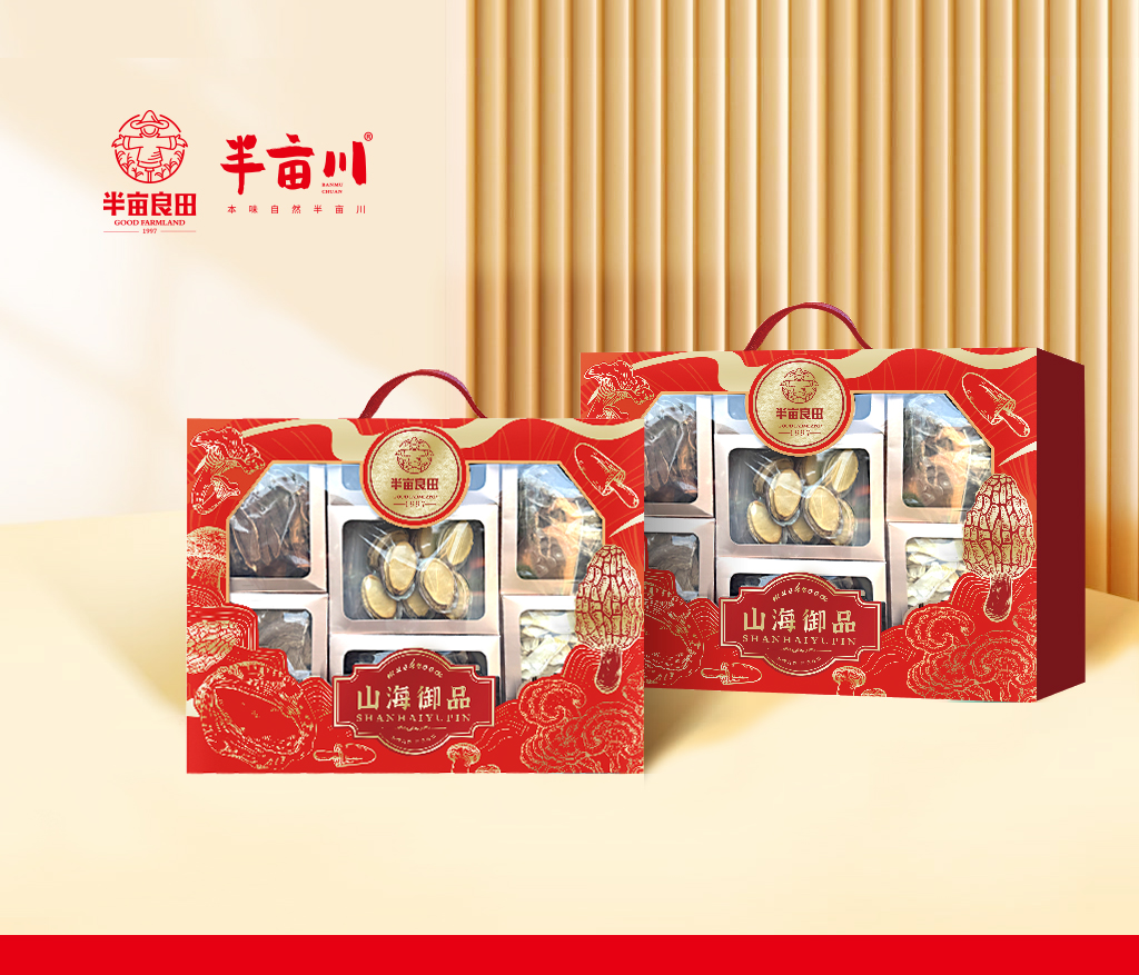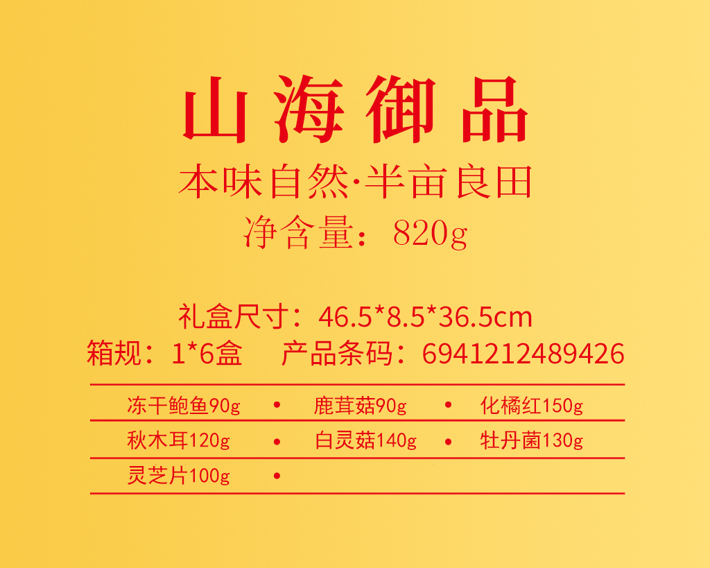 半亩川 山珍海味鲍鱼鹿茸菇化橘红灵芝片白灵菇牡丹菌秋木耳礼盒 山海御品礼盒 820g 混色(单位:盒)
