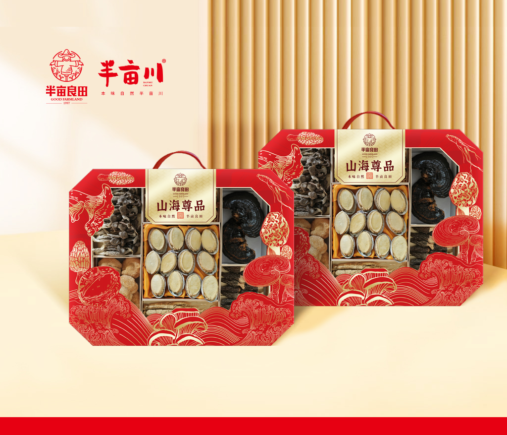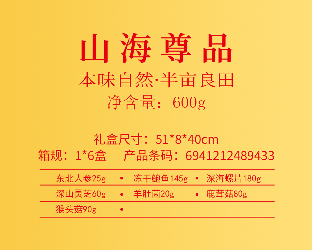 半亩川 山珍海味人参鲍鱼螺片灵芝羊肚菌鹿茸菇猴头菇礼盒 山海尊品礼盒 600g 混色(单位:盒)