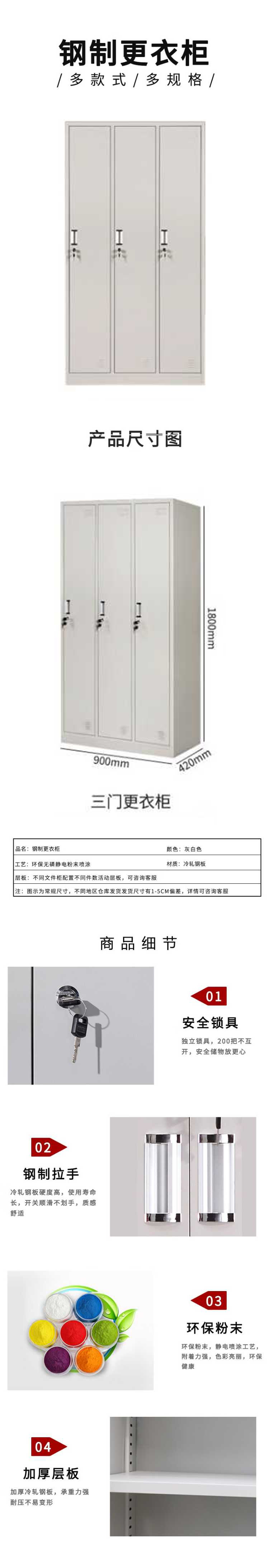 企诺 更衣柜储物柜文件柜三门 QB006 900*420*1800mm 0.4mm 灰白色(单位:个)