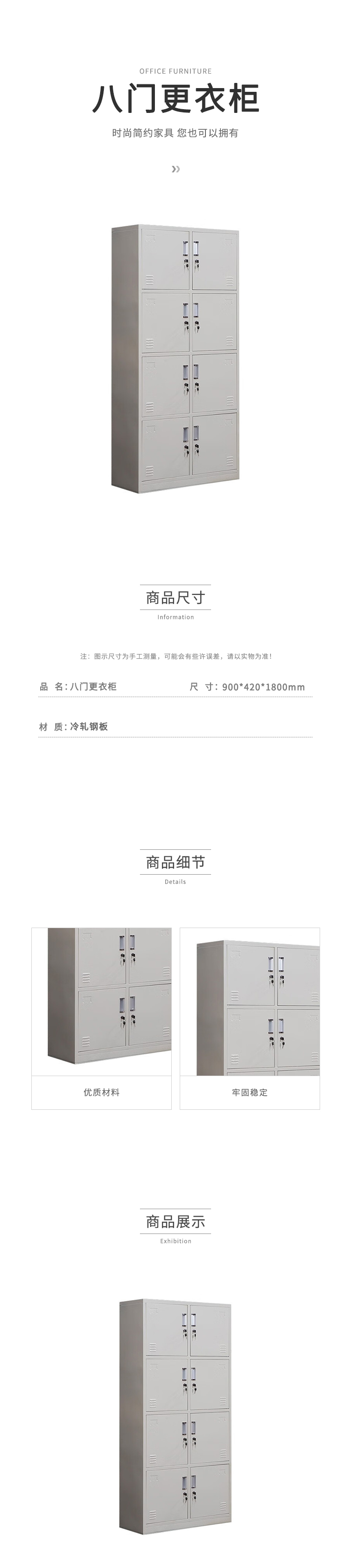 企诺 更衣柜铁皮柜储物柜八门 QB017 900*420*1800mm|0.6mm 灰白色(单位:个)