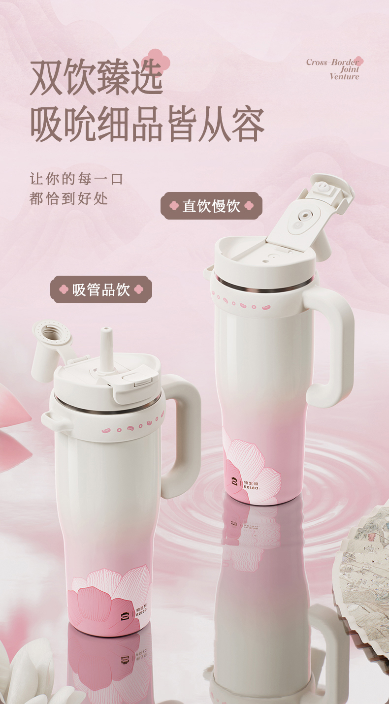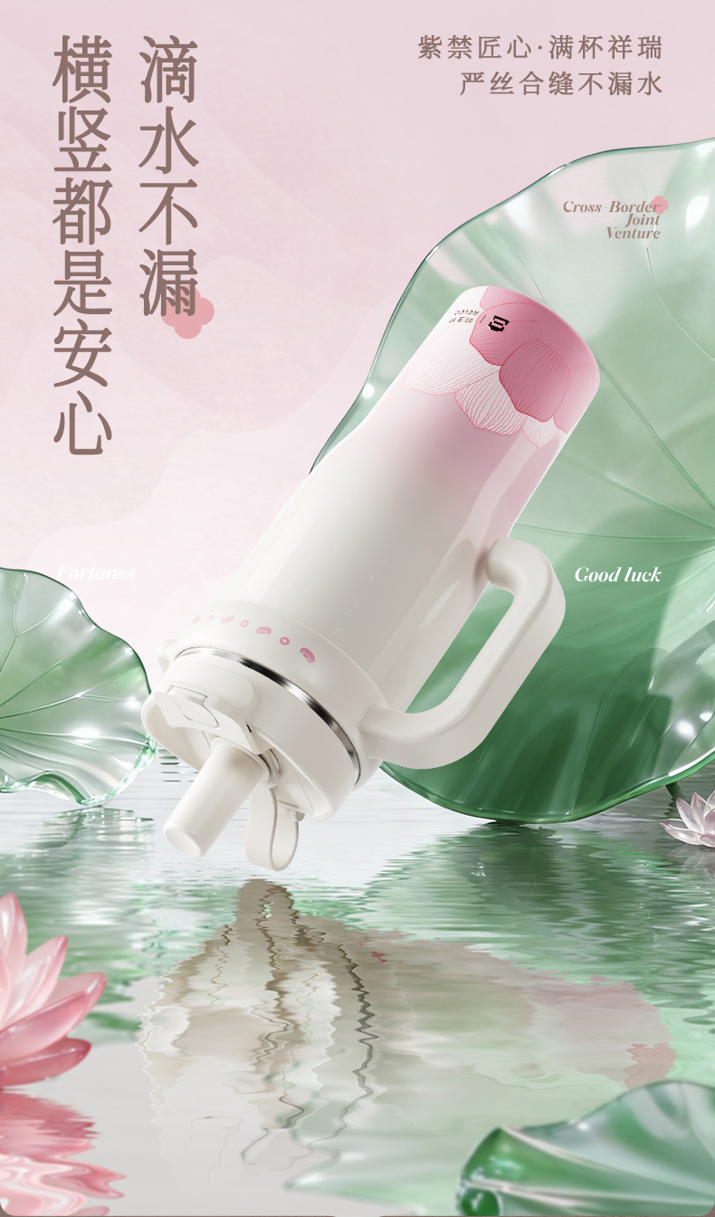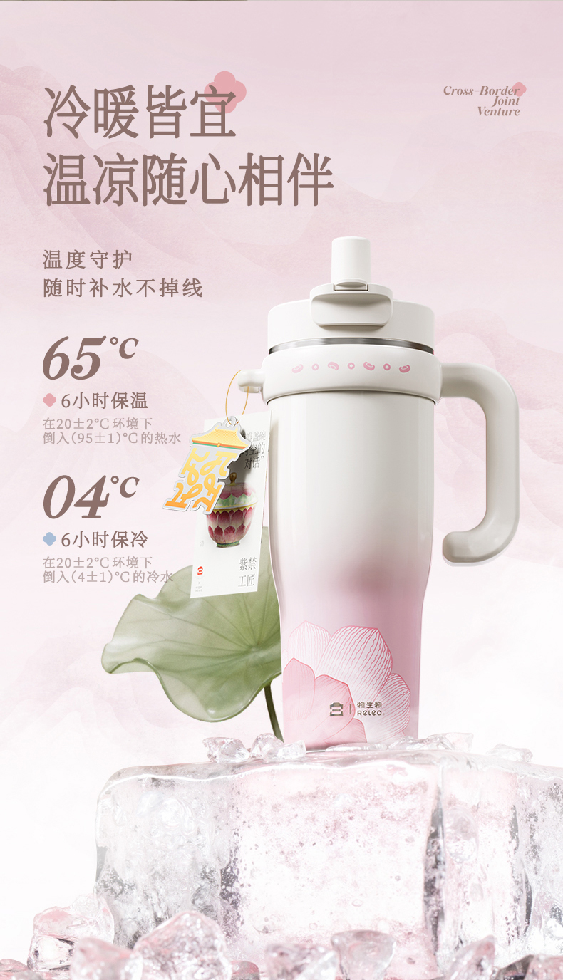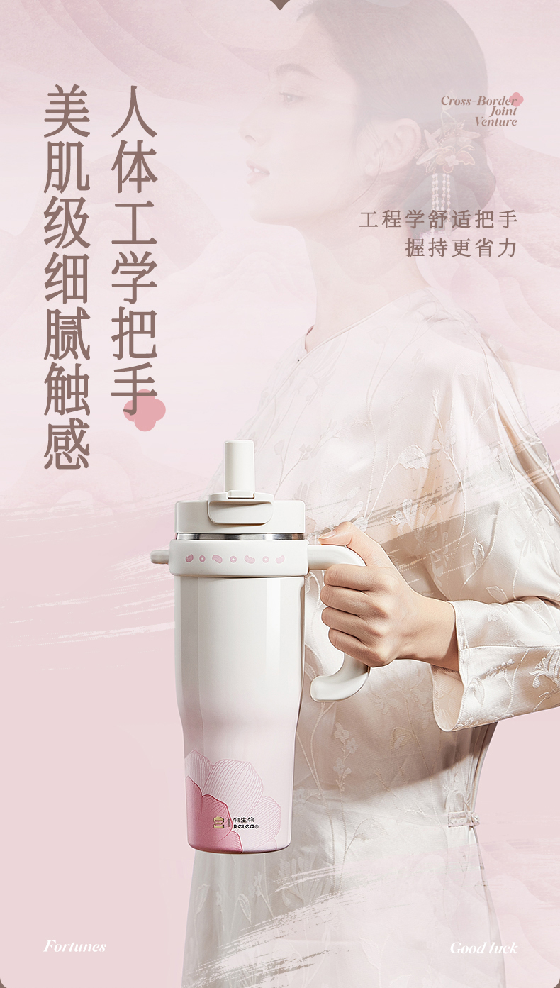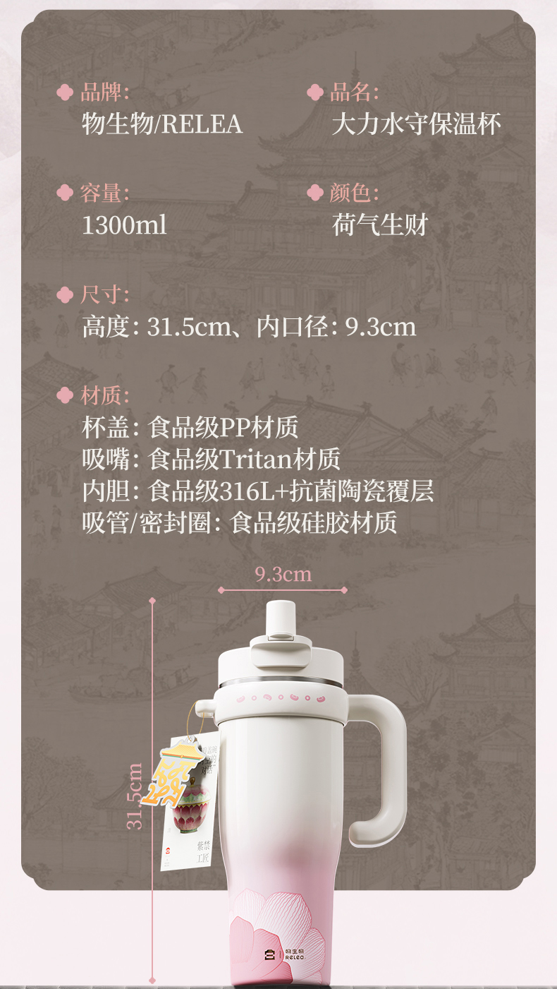 物生物(RELEA) 大力水守陶瓷内胆保温杯把手款 JV012566-1300-FQ00 1300ML 荷气生财(单位:个)
