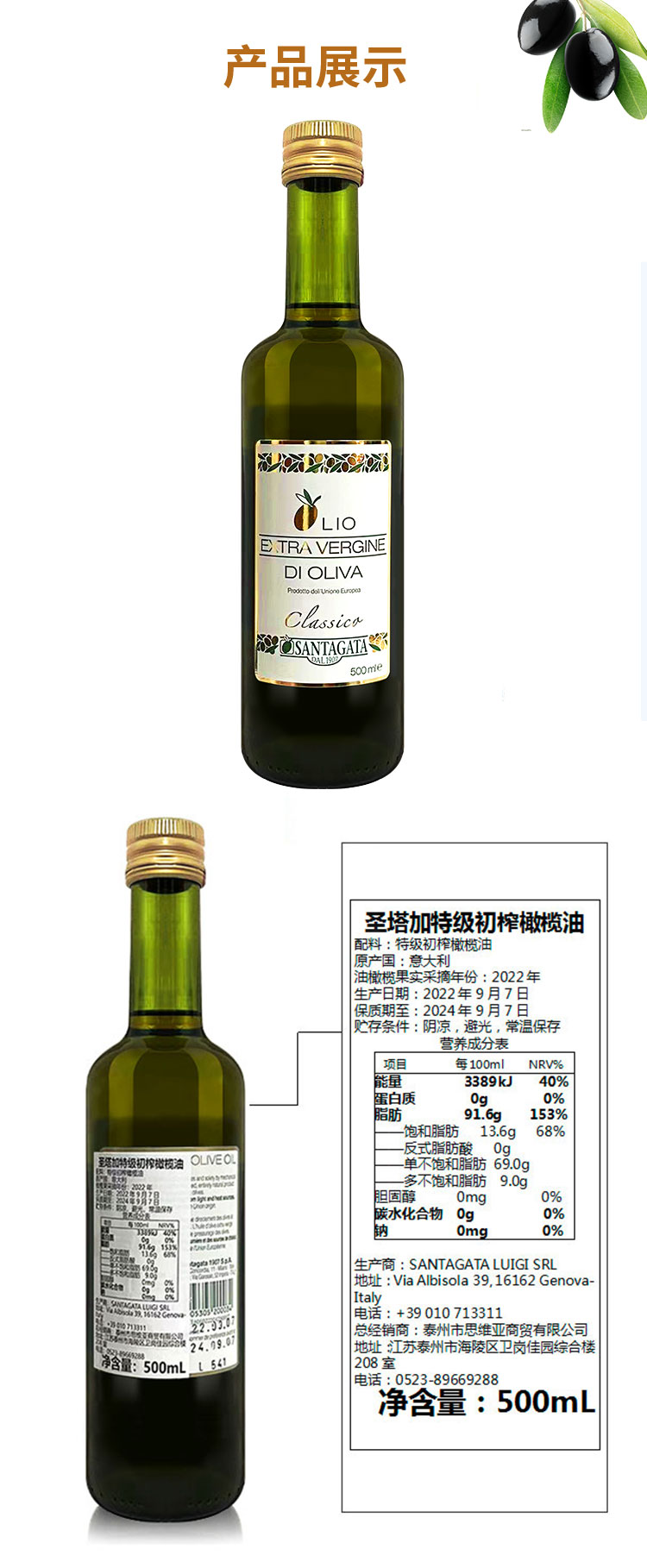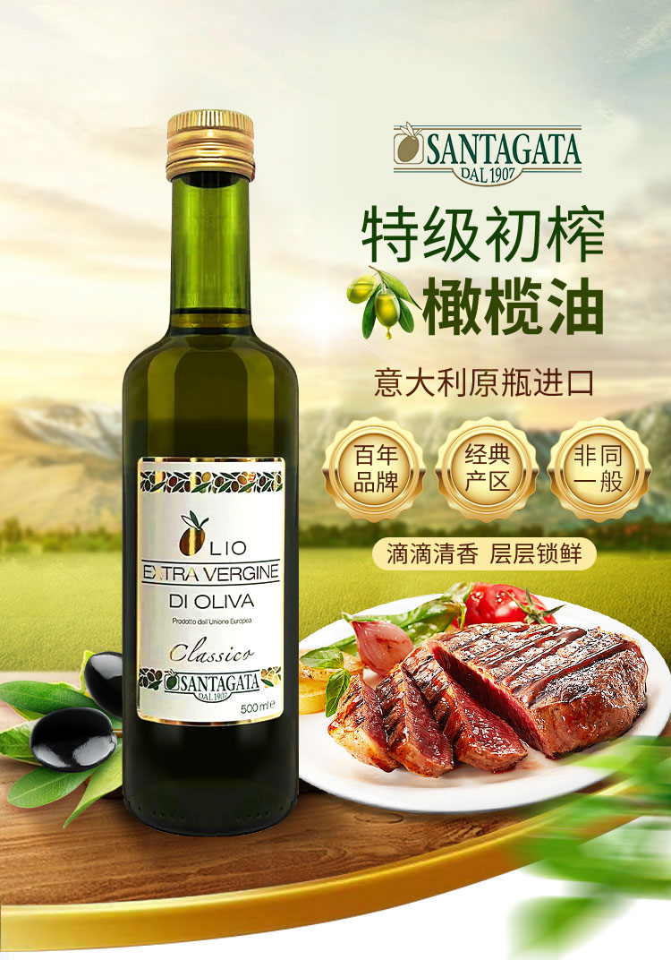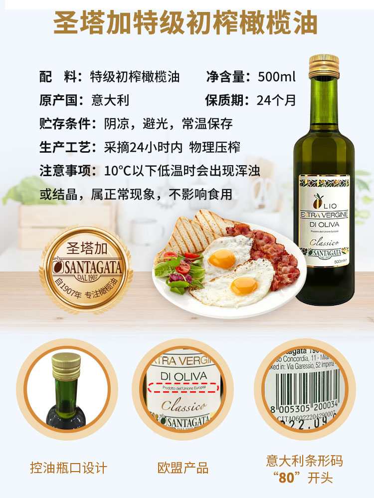 圣塔加 意大利原瓶进口 特级初榨橄榄油 500ml*1瓶 混色(单位:瓶)