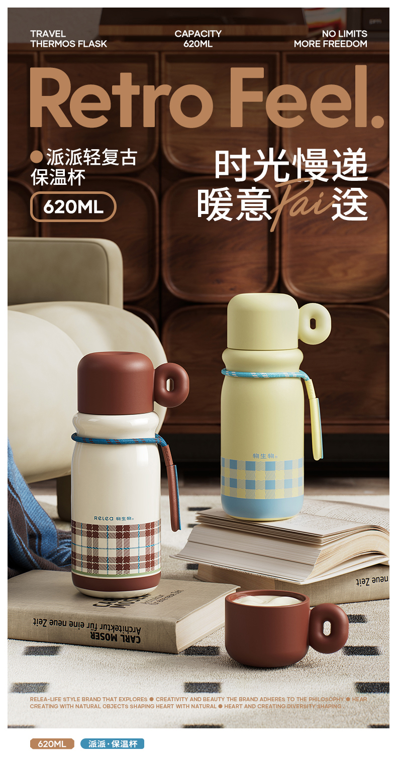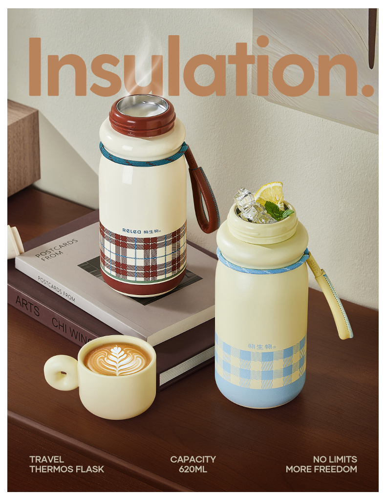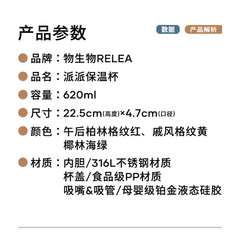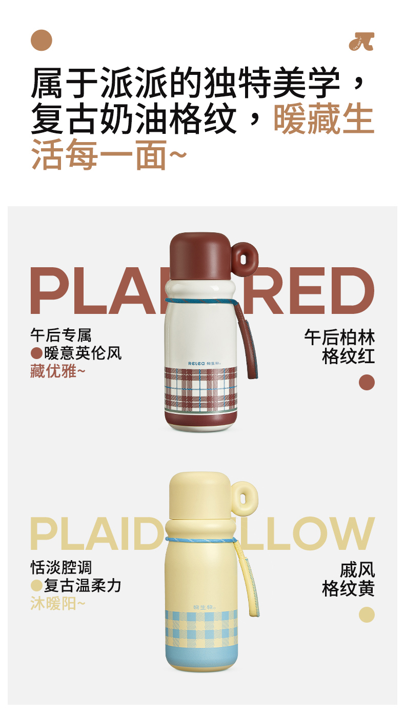 物生物(RELEA) 派派保温杯 JV012549-0620-HS00 620ML 午后柏林格纹红(单位:个)