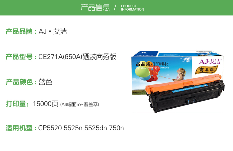 艾洁(AJ) CE271A(650A)商务版 打印量15000页 适用CP5520 5525n 5525dn 750n 硒鼓 (计价单位:只) 蓝色