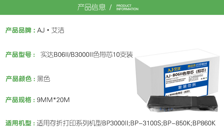 艾洁(AJ) B3000II/B06II 十支装 打印量9MM*20M 适用适用实达BP3000II/BP-3100S/BP-850K/BP860K 色带芯 (计价单位:盒) 黑色
