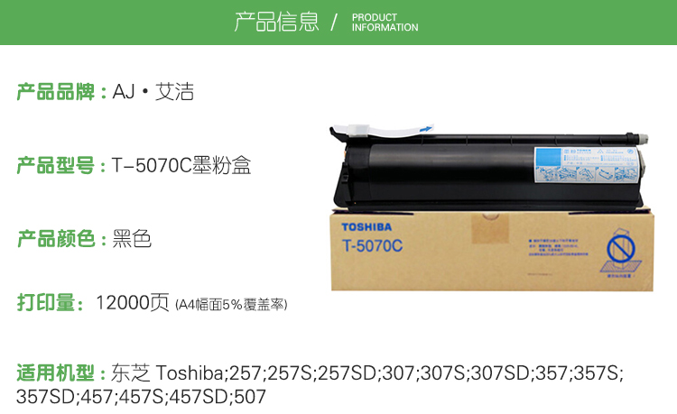 艾洁(AJ) T-5070C 打印量12000页 适用东芝257/257S/257SD/307/307S/307SD/357/357S/357SD/457/ 粉盒 (计价单位:只) 黑色