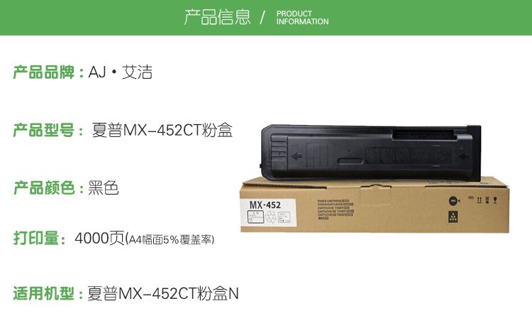 艾洁(AJ) MX-452CT 打印量40000页 适用夏普AR-MX-452U 粉盒 (计价单位:只) 黑色