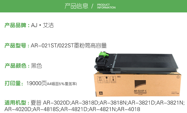 艾洁(AJ) AR-021ST 打印量19000页 适用夏普 AR-3020D/AR-3818D/AR-3818N/AR-3821D/AR-3821N/AR-4020D/ 粉筒 (计价单位:只) 黑色