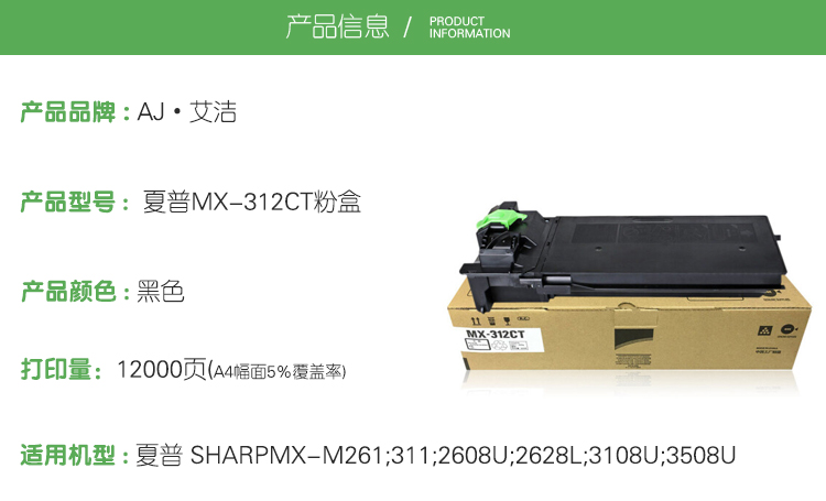 艾洁(AJ) MX-312CT 打印量12000页 适用夏普 SHARPMX-M261;311;2608U;2628L;3108U;3508U 粉盒 (计价单位:只) 黑色