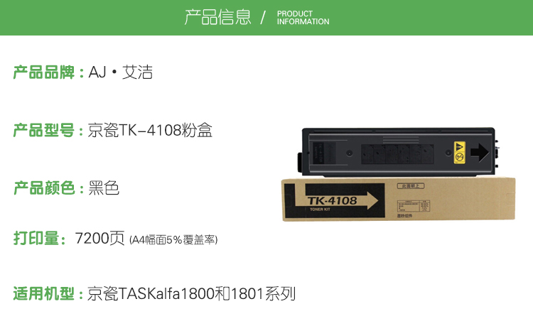 艾洁(AJ) TK-4108 打印量7200页 适用京瓷TASKalfa1800和1801系列 粉盒 (计价单位:只) 黑色