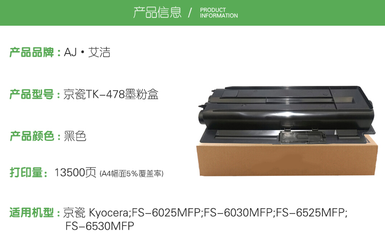 艾洁(AJ) TK-478 打印量13500页 适用京瓷 Kyocera/FS-6025MFP/FS-6030MFP/FS-6525MFP/FS-6530MFP 粉盒 (计价单位:只) 黑色