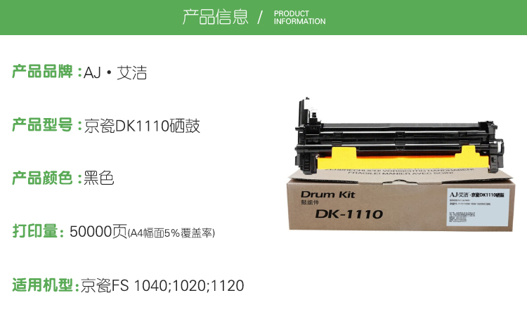 艾洁(AJ) DK1110 打印量50000页 适用京瓷FS 1040/1020/1120 硒鼓 (计价单位:只) 黑色