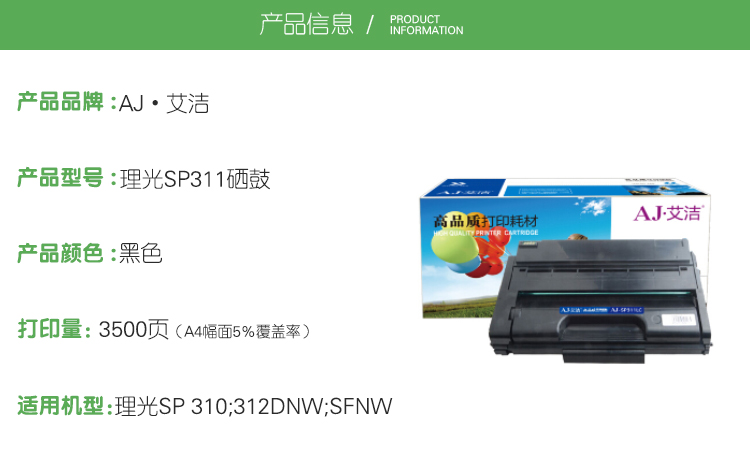 艾洁(AJ) SP311 打印量3500页 适用理光SP 310;312DNW;SFNW 硒鼓 (计价单位:只) 黑色 黑色