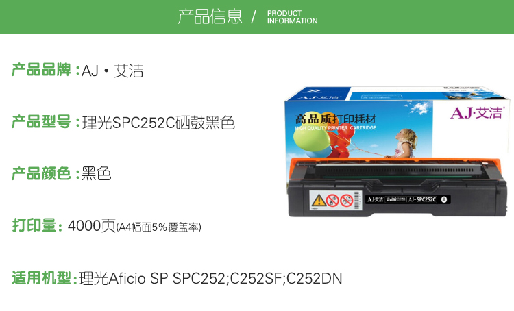 艾洁(AJ) SPC252C 打印量4000页 适用理光Aficio SP SPC252/C252SF/C252DN 硒鼓 (计价单位:只) 黑色