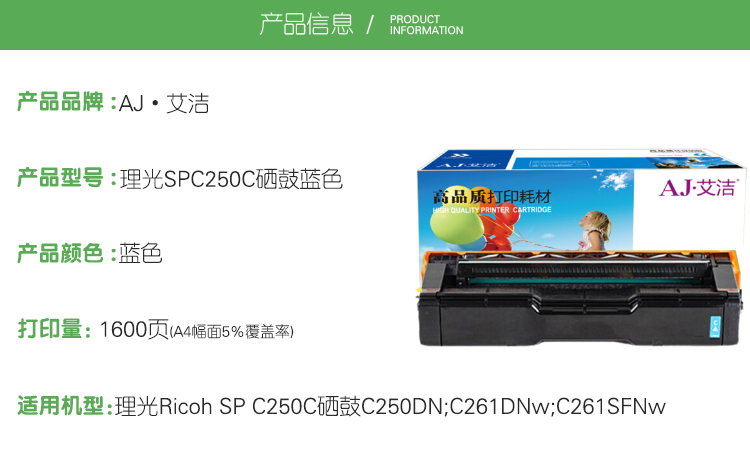 艾洁(AJ) SPC250C 打印量1600页 适用理光Ricoh SP C250CC250DN;C261DNw;C261SFNw 硒鼓 (计价单位:只) 蓝色 蓝色