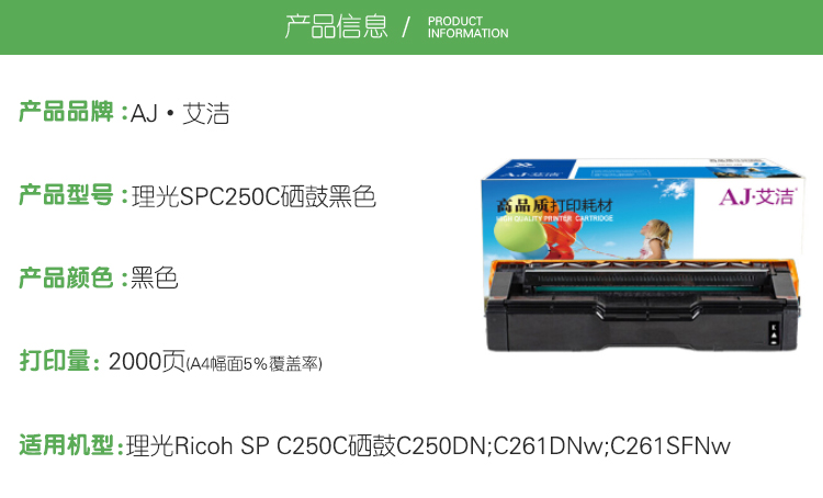 艾洁(AJ) SPC250C 打印量2000页 适用理光Ricoh SP C250CC250DN;C261DNw;C261SFNw 硒鼓 (计价单位:只) 黑色 黑色