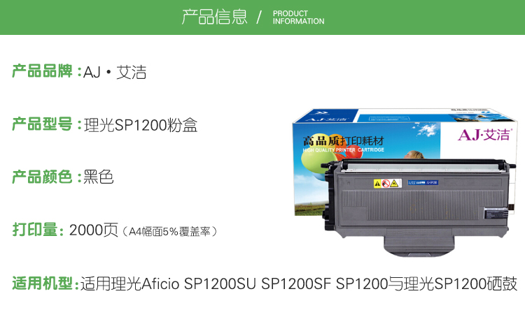 艾洁(AJ) SP1200 打印量2000页 适用理光Aficio SP1200SU SP1200SF SP1200与理光SP1200硒鼓配合 粉盒 (计价单位:只) 黑色 黑色