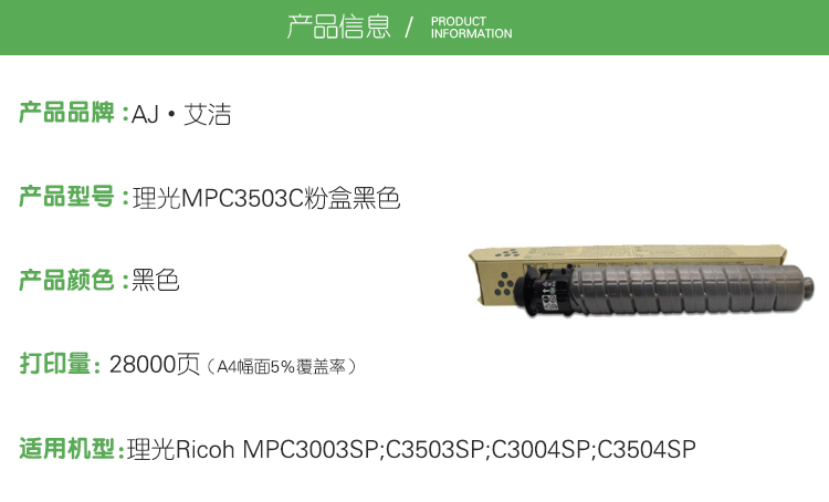 艾洁(AJ) MPC3503C 打印量28000页 适用理光Ricoh MPC3003SP/C3503SP/C3004SP/C3504SP 粉盒 (计价单位:只) 黑色 黑色