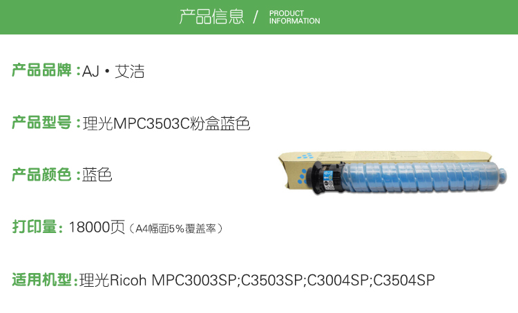 艾洁(AJ) MPC3503C 打印量18000页 适用理光Ricoh MPC3003SP/C3503SP/C3004SP/C3504SP 粉盒 (计价单位:只) 蓝色 蓝色