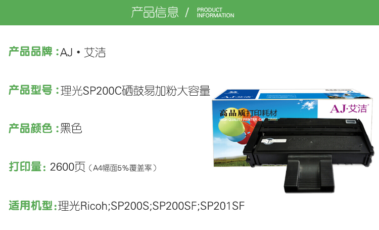 艾洁(AJ) SP200C易加粉大容量 打印量2600页 适用理光Ricoh/SP200S/SP200SF/SP201SF 硒鼓 (计价单位:只) 黑色 黑色