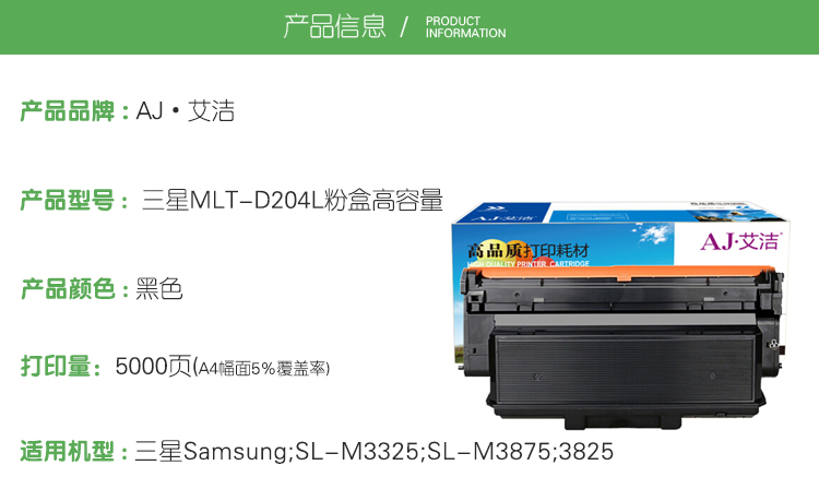 艾洁(AJ) MLT-D204L高容量5000页 打印量5000页 适用三星Samsung/SL-M3325/SL-M3875/3825 粉盒 (计价单位:只) 黑色 黑色