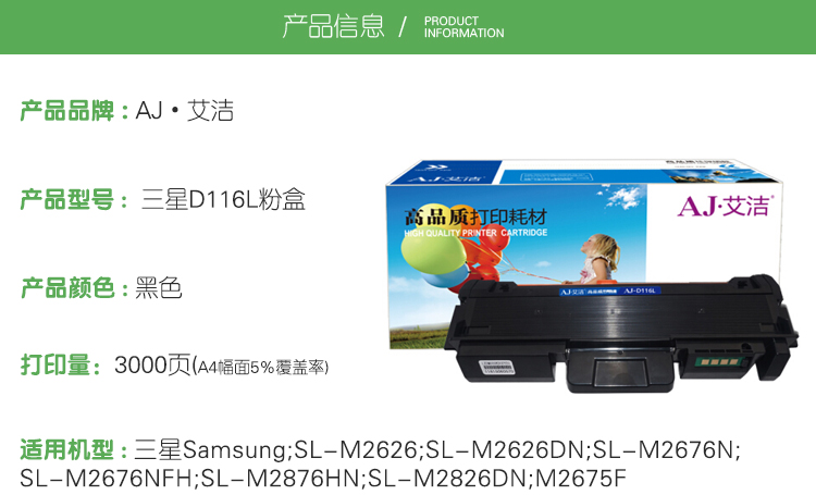 艾洁(AJ) D116L 打印量3000页 适用三星Samsung/SL-M2626/SL-M2626DN/SL-M2676N/SL-M2676NFH/SL-M2876 粉盒 (计价单位:只) 黑色