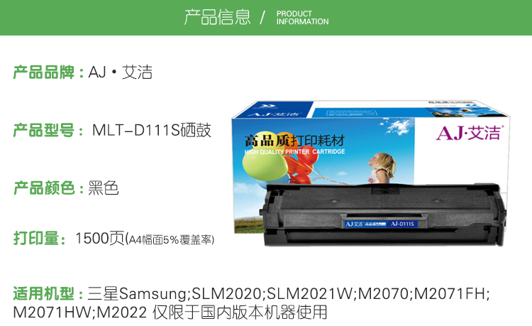 艾洁(AJ) MLT-D111S 打印量1500页 适用三星Samsung/SLM2020/SLM2021W/M2070/M2071FH/M2071HW/M2022 硒鼓 (计价单位:只) 黑色