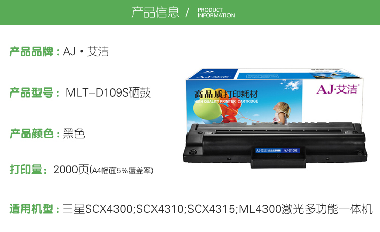 艾洁(AJ) MLT-D109S 打印量2000页 适用三星SCX4300/SCX4310/SCX4315/ML4300激光多功能一体机 硒鼓 (计价单位:只) 黑色