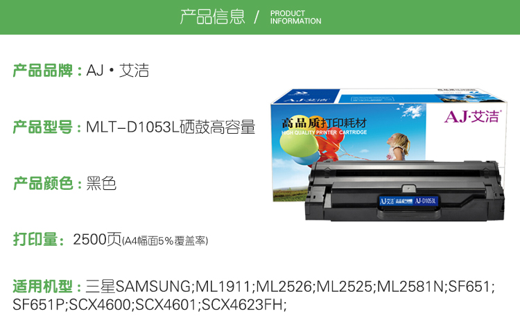 艾洁(AJ) MLT-D1053L高容量 打印量2500页 适用三星SAMSUNG;ML1911;ML2526;ML2525;ML2581N;SF651;SF651 硒鼓 (计价单位:只) 黑色