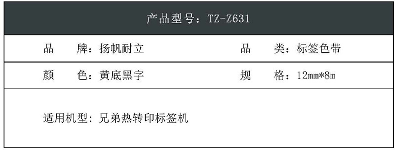 扬帆耐立(YFHC) TZ-Z631 商专版 打印量12mm*8m 适用机型兄弟热转印标签机 黄底黑字 标签胶贴 (计价单位:个) 黄底黑字
