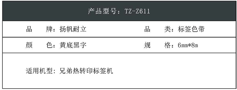 扬帆耐立(YFHC) TZ-Z611 商专版 打印量6mm*8m 适用机型兄弟热转印标签机 黄底黑字 标签胶贴 (计价单位:个) 黄底黑字