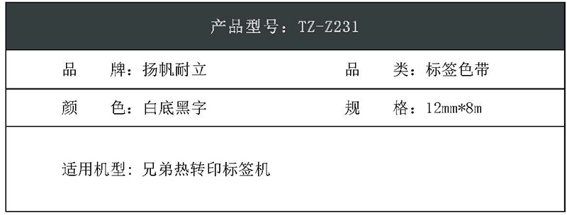 扬帆耐立(YFHC) TZ-Z231 商专版 打印量12mm*8m 适用机型兄弟热转印标签机 白底黑字 标签胶贴 (计价单位:个) 白底黑字