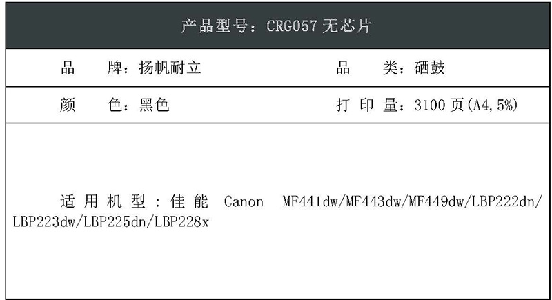 扬帆耐立(YFHC) CRG057无芯片 商专版 适用机型佳能Canon MF441dw/MF443dw/MF449dw/LBP222dn 硒鼓 1.00 只/支 (计价单位:支) 黑色 黑色