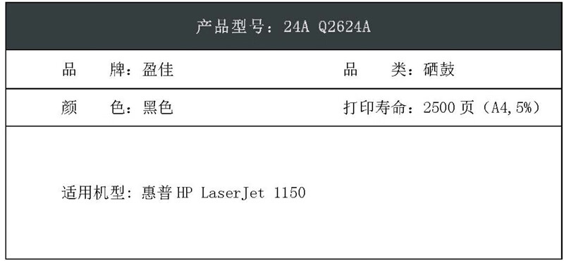 盈佳(Ink Cartridge) 24A Q2624A 商专版 打印量2500页 适用机型惠普HP LaserJet 1150 黑色 硒鼓 1.00 只/个 (计价单位:个) 黑色