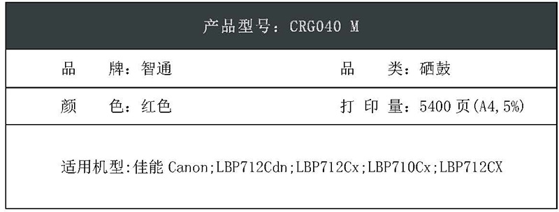 智通(ZT) CRG040 M 带芯片 5400页 适用佳能Canon LBP712Cdn LBP712Cx LBP710Cx LBP712CX 硒鼓 1.00 只/个 (计价单位:个) 红色