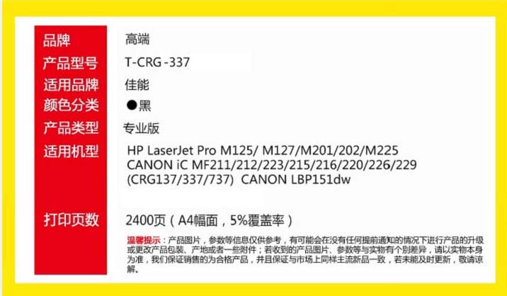高端 T-CRG-337 打印量2400页 适用佳能CRG337硒鼓 MF223D mf215硒鼓 佳能MF211硒鼓 硒鼓 1.00 只/个 (计价单位:个) 黑色
